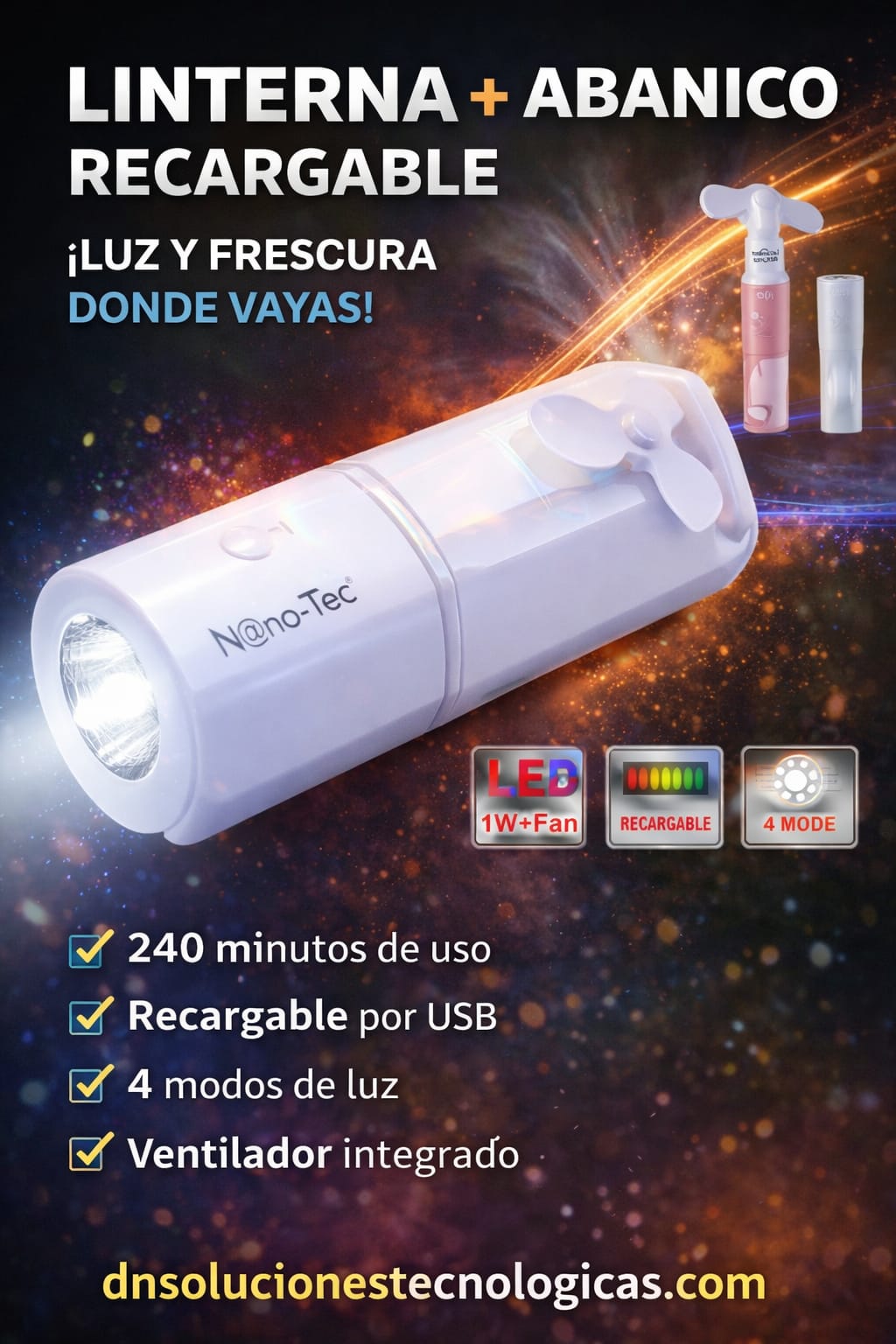 La Linterna Nanotec con Ventilador combina luz LED potente y ventilación portátil en un solo equipo práctico y compacto. Ideal para camping, emergencias o uso diario, brinda iluminación confiable y frescura cuando más lo necesitas. 🔦💨