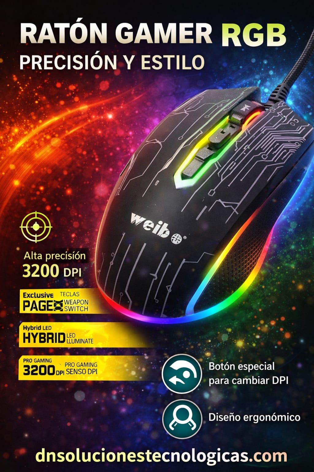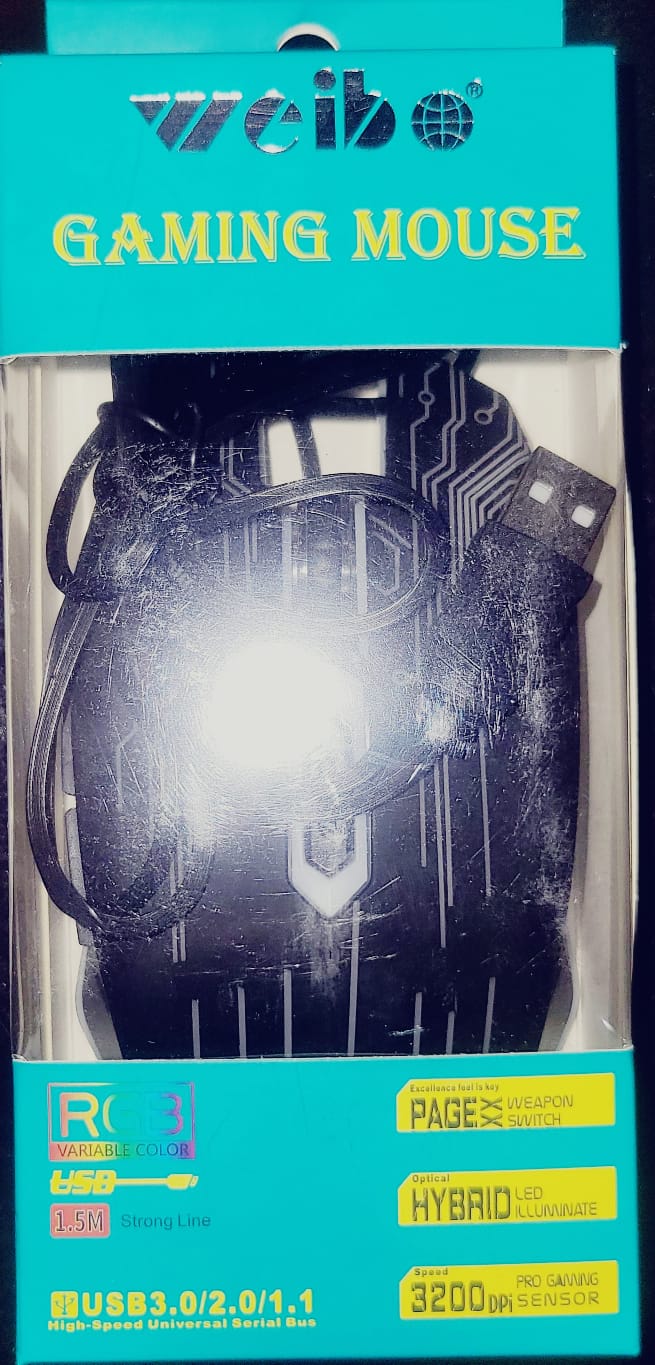 El Mouse Gamer WEIBO Ortho-Pin Light RGB ofrece precisión óptica, iluminación LED multicolor y diseño ergonómico para largas sesiones de juego. Ideal para gamers que buscan rendimiento, comodidad y estilo en su setup. 🎮