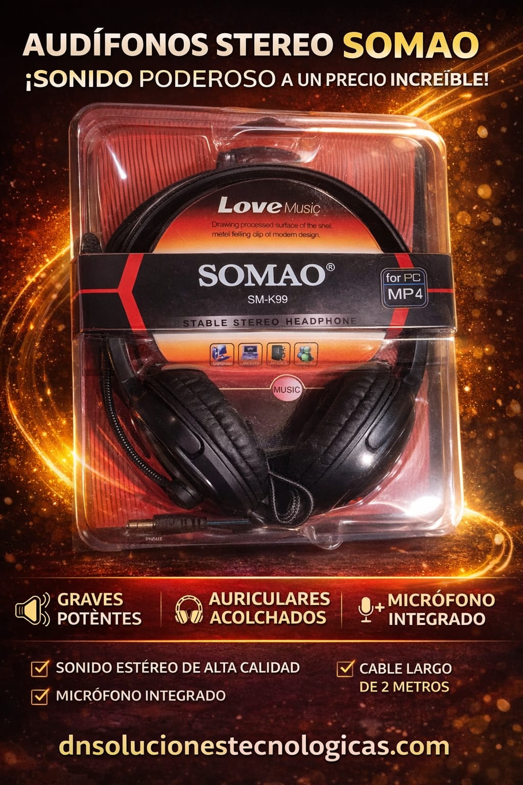 Los Audífonos Stereo SOMAO con micrófono ofrecen sonido claro y graves definidos en un diseño cómodo y elegante. Perfectos para música, llamadas, estudio o gaming casual, brindan calidad y versatilidad en cada uso. 🎧